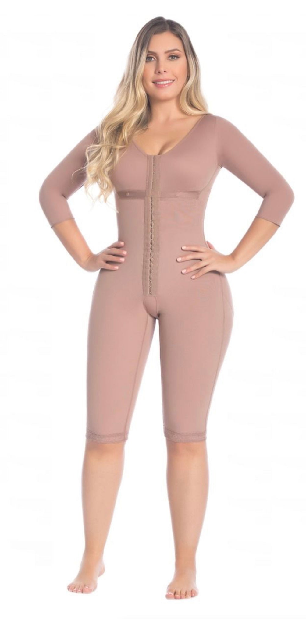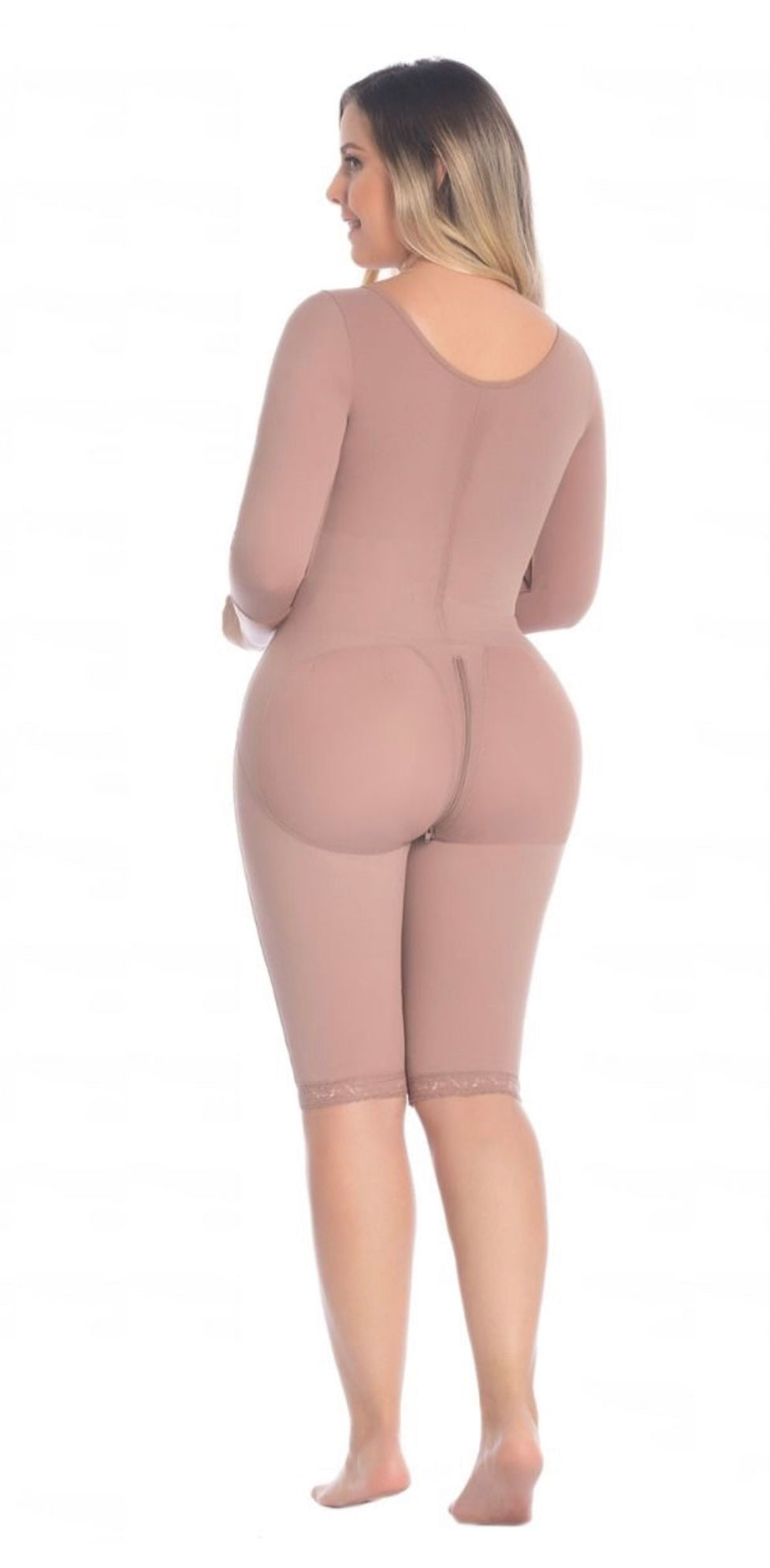 Designed for post liposuction recovery. This Faja is called a 360 faja because it will help you recover and minimize inflation to any part of your body that recently underwent surgery. Long sleeve and low back make this Faja easy to wear under any outfit. Perineal zipper closure.