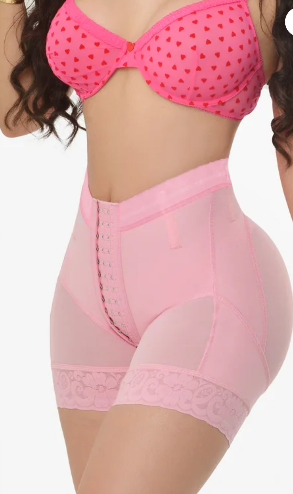 Extreme butt-lift panty designed for bodies with a BBL or a naturally small waist and fuller glutes. Requires approximately a 10+ inch difference between the waist and hips for the best fit. Provides lower-belly compression and includes 3 rows of hooks, 4 steel bones in the waistband to prevent folding, and silicone on the legs and waistband to prevent rolling or sliding. Features a bottom zipper for easy restroom use. Made with powernet on the outside and lycra on the inside. Charm is not reinforced for easy removal if desired.