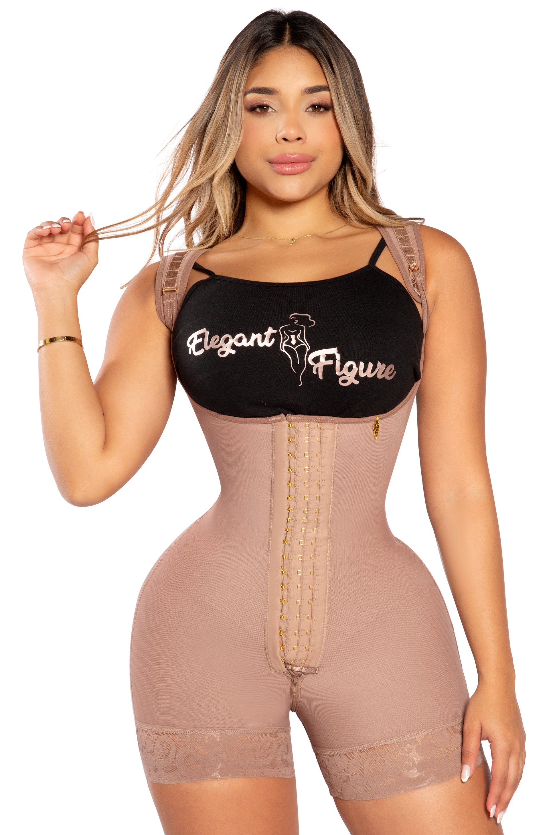 Extreme-compression faja designed for third-stage or everyday use. Recommended for bodies with less than a 10-inch difference between the waist and hips. Features three steel bones—one on each side of the waist and one centered in the back—for added structure and stability. Designed with three rows of hooks and adjustable straps for a customizable fit. Provides a seamless butt-lift effect with double-layer fabric, featuring lycra on the interior and powernet on the exterior. Includes silicone on the legs to help prevent rolling. Runs small; sizing up one to two sizes is recommended. The charm is not reinforced so it can be easily removed if desired.