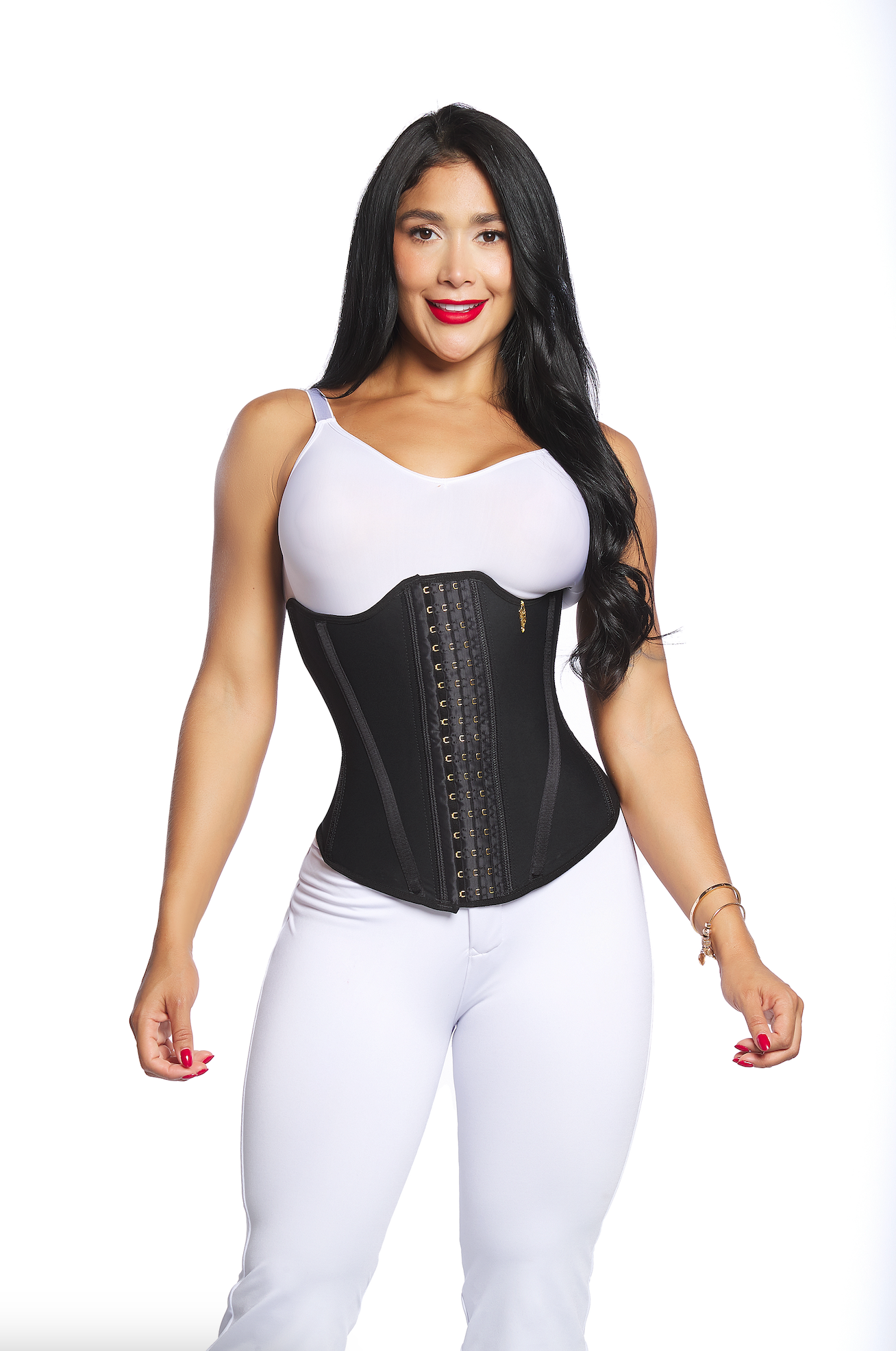 High-compression waist trainer featuring 9 steel bones for structured shaping. Designed with a high back to help prevent back-fat and a long front for enhanced lower-belly coverage. Includes 3 rows of hooks for adjustable compression and a secure fit. Made with powernet on the outside and cotton on the inside for comfort.