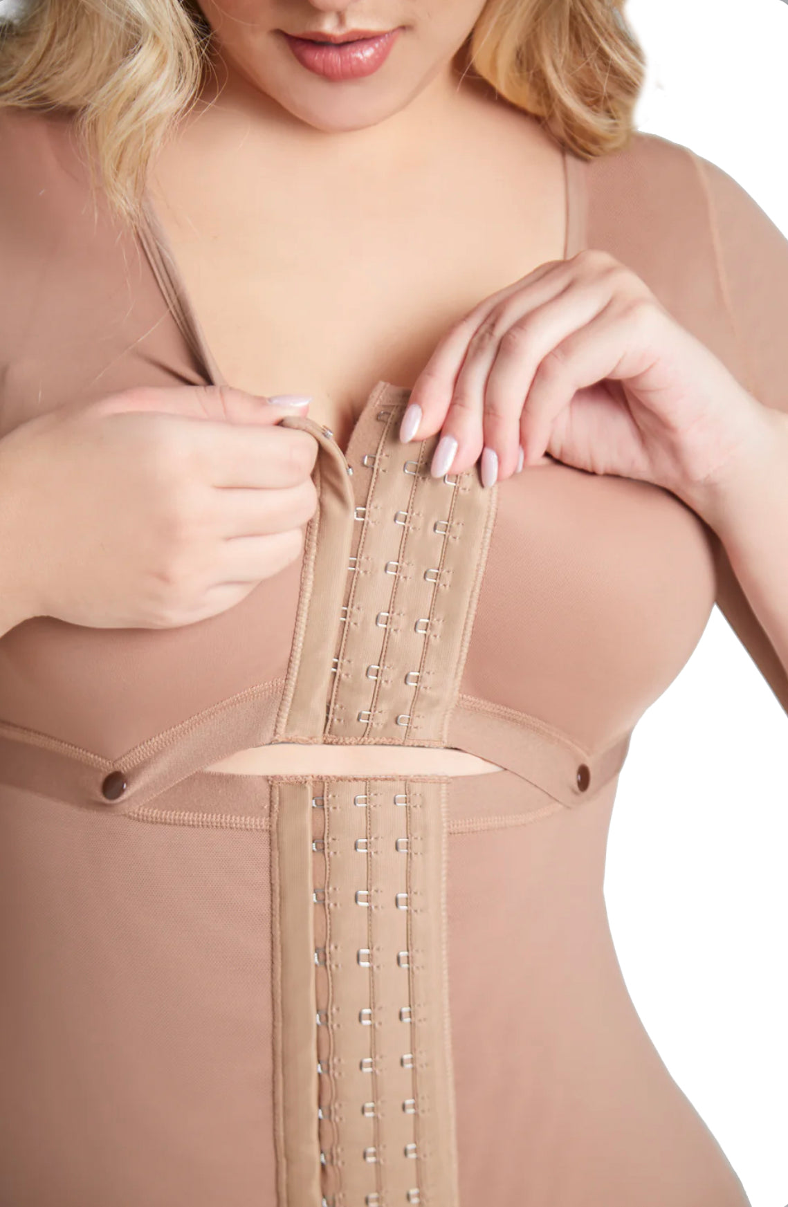 On top of that, this bodysuit has a brassiere, three-quarter-length sleeves, and shorts that reach the knee. That kind of coverage means almost the whole body is covered; the booty gets a natural-looking lift, the breasts are similarly lifted and supported, the torso is slimmed and smoothed, and the hips' natural curves are accentuated beautifully.