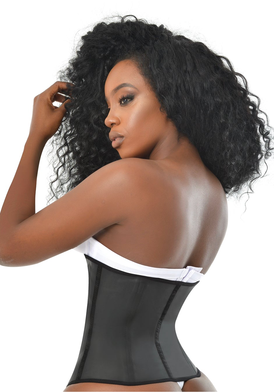 Long-torso latex waist trainer designed for workouts. Increases abdominal sweating and is recommended for 6–8 hours of wear per day. Provides medium to high compression. Features 4 rows of hooks and 4 steel bones for structure. Made with latex on the outside and cotton on the inside for comfort.