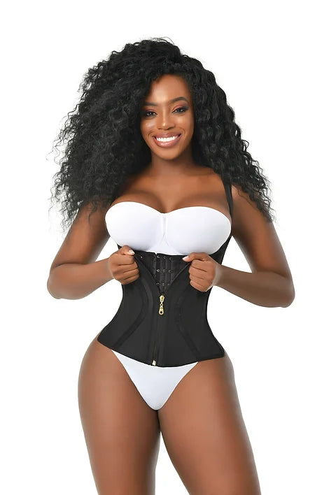Extreme-compression vest designed for advanced shaping with full back coverage. Features 13 steel bones for firm structure, two layers of powernet—an upper zipper layer with an all-around elastic band for added curve and targeted compression. The inner layer includes three rows of hooks for an adjustable fit. Cotton lining for comfort. Full back and thick straps provide enhanced back support and complete coverage. Strap style may vary depending on current inventory; customers may receive the updated straps or the previous version. Charm is not reinforced for easy removal if desired. Recommended to size up for customers unfamiliar with extreme-compression garments.