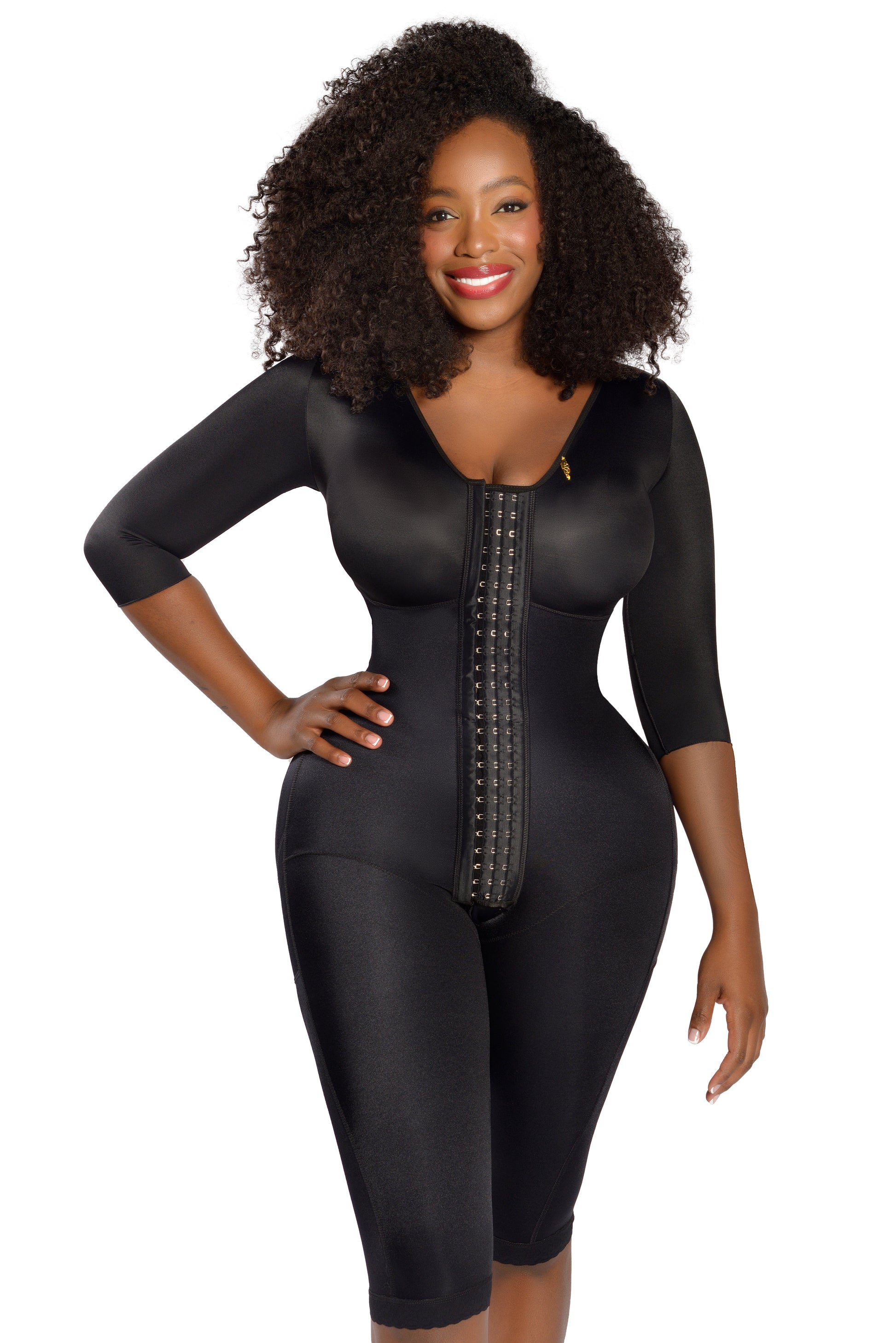 Faja de primera etapa con compresión media a alta, ideal para las primeras dos semanas postoperatorias después de una BBL o liposucción. Diseñada para cuerpos con una diferencia de 10 pulgadas o más entre la cintura y la cadera para un mejor ajuste. Incluye bra y mangas integradas, recomendada para pacientes con liposucción en brazos o reducción/aumento de busto. Brinda cobertura y soporte completo en la espalda, ayudando a reducir la inflamación y a mantener la forma. La pierna larga llega hasta la rodilla, ayudando a reducir la inflamación si se realizó liposucción en las piernas. Cuenta con tres filas de broches para un ajuste regulable y cierre inferior para facilitar el uso del baño. Fabricada de lycra. El dije no viene reforzado para que pueda retirarse fácilmente si se desea.
