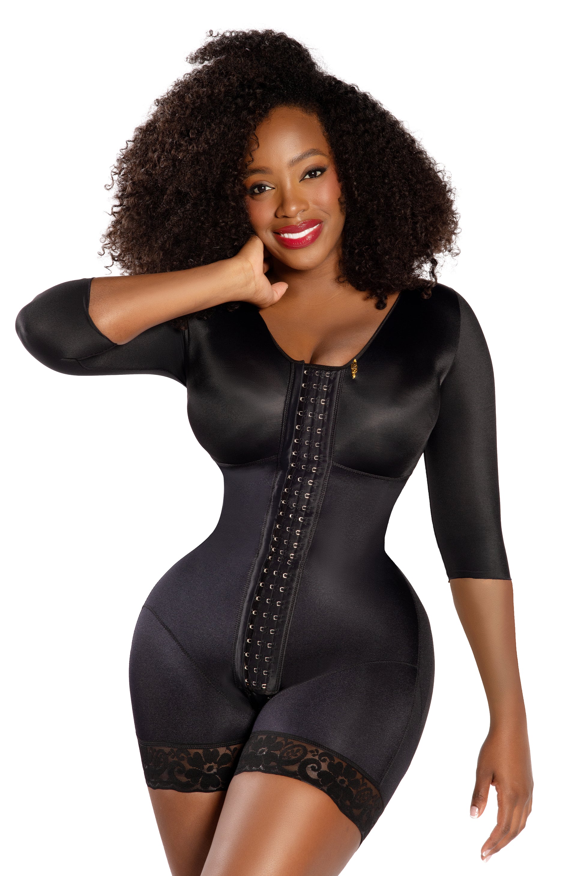 First-stage garment with medium to high compression, ideal for the first two weeks post-operation after BBL or liposuction. Designed for bodies with a 10-inch or greater difference between the waist and hips for best fit. Includes integrated bra and arm coverage, suitable for clients who have had arm liposuction or breast reduction/augmentation. Provides full back coverage and support to help reduce swelling and maintain shape. Features three rows of hooks for adjustability, silicone on the legs to help prevent rolling, and a bottom zipper for easy restroom access. Made of lycra. The charm is not reinforced so it can be easily removed if desired.