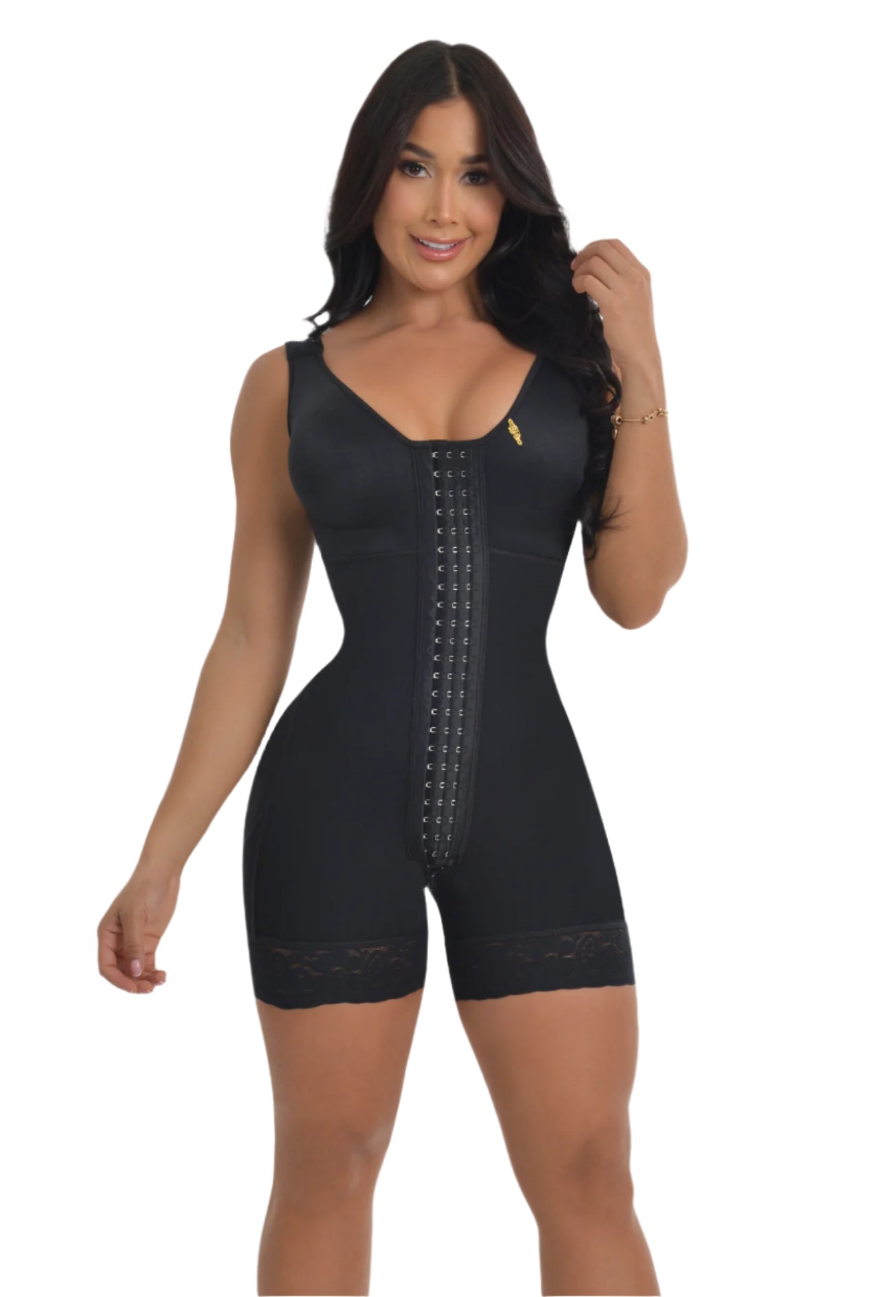 High-compression, second-stage faja designed for post-op BBL or tummy tuck. Recommended for bodies with a waist-to-hip difference of 10 inches or more and for use starting two weeks after surgery. Designed with a smaller waist and roomier hips to protect fat transfers, maintain shape, and reduce swelling. Includes an integrated bra, suitable for clients who have had breast reduction or augmentation. Features three rows of hooks, a bottom zipper for easy restroom access, and silicone on the legs to help prevent rolling. Made with powernet on the exterior and lycra on the interior for firm, comfortable compression. Sizing up is recommended if using foams or boards. The size chart on our website is the most up-to-date and accurate; the chart included in the product packaging is outdated. The charm is not reinforced so it can be easily removed if desired.