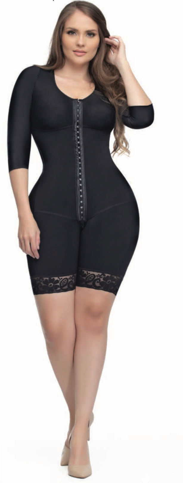 Our post-surgical half leg guitar body girdle offers you maximum control in your abdomen, back, waist, which makes your figure look stylized. It has double fabric in the abdomen that gives high compression in this area, with a two-level front fastening, preshaped cup and fitted sleeve made of material with properties that promote healing, softness and elasticity of the skin, while toning your arms. It has ergonomic seams in the buttocks area that naturally enhances them and a rounded shape. X-shaped back reinforcement which will help you improve your position. It is ideal for daily use if you have experience in shaping your body and for post-surgical use.