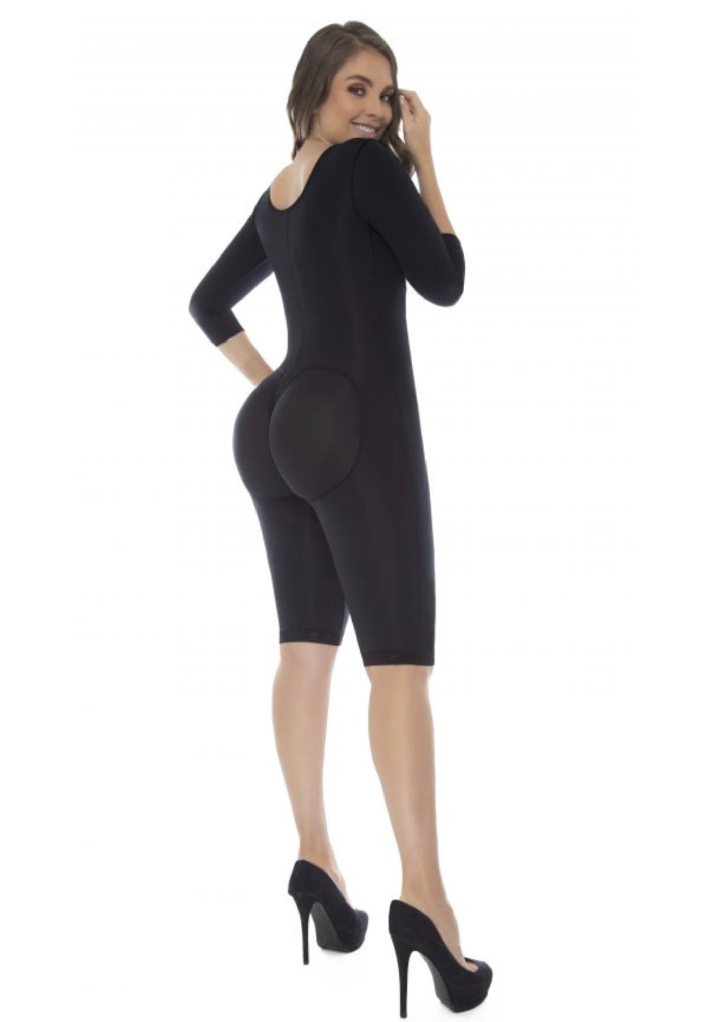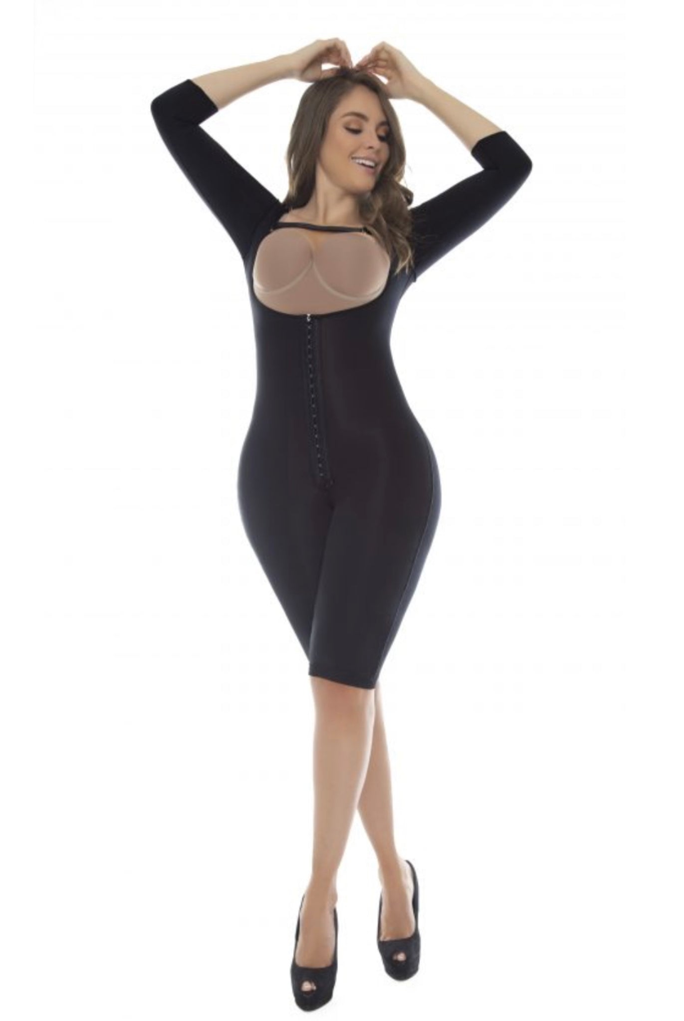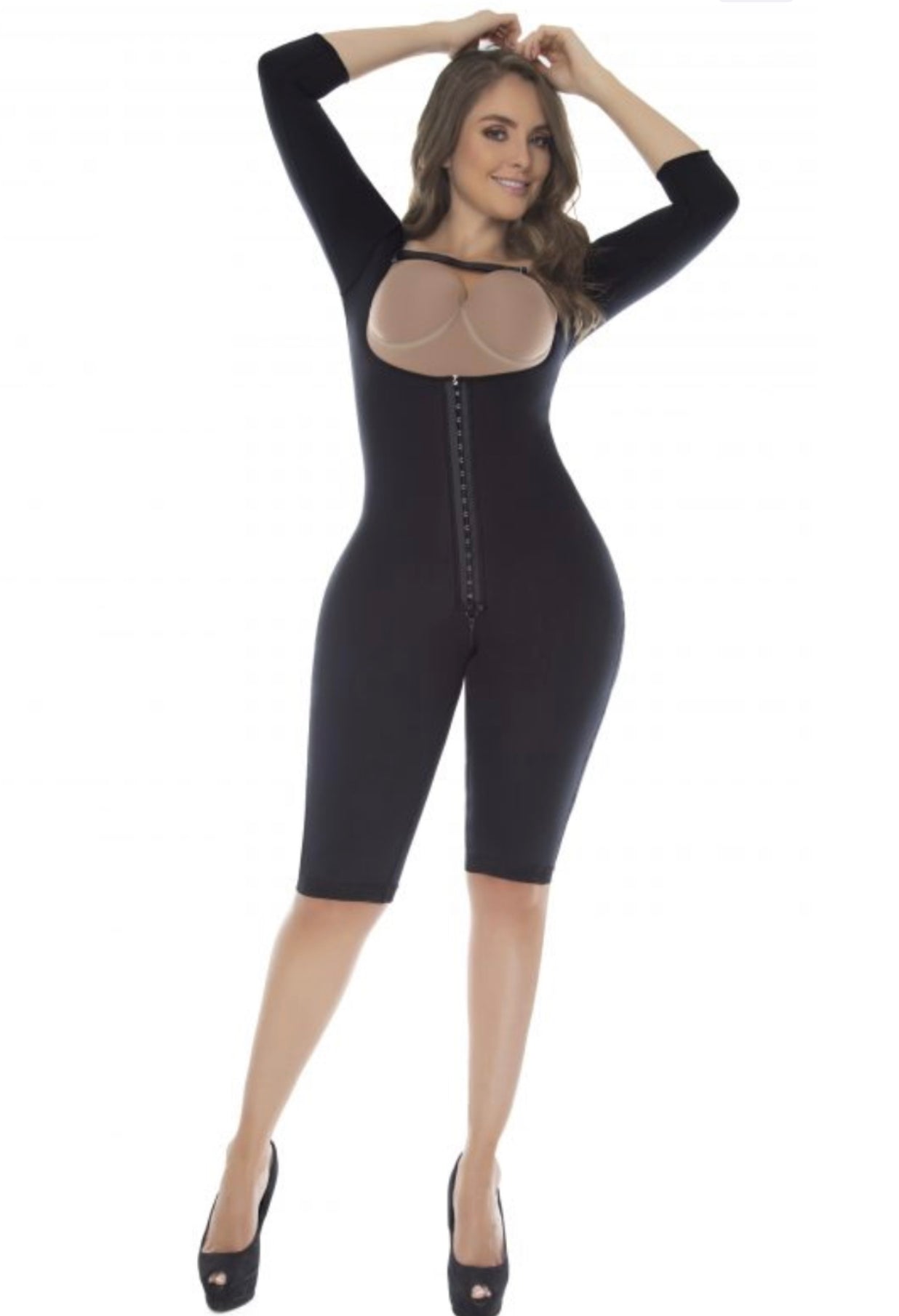 This guitar body girdle is ideal for first posture after a surgical process, essential during the first weeks, it has cold-touch Lycra that helps eliminate fluids by reducing inflammation. It has a three-level front clasp for gradual compression according to your needs, ample back coverage and a free bust with a strap that does not allow the garment to roll up in the armhole area and allows you to center the bust, as well as a sleeve fitted to tone arms, cut below the knee.