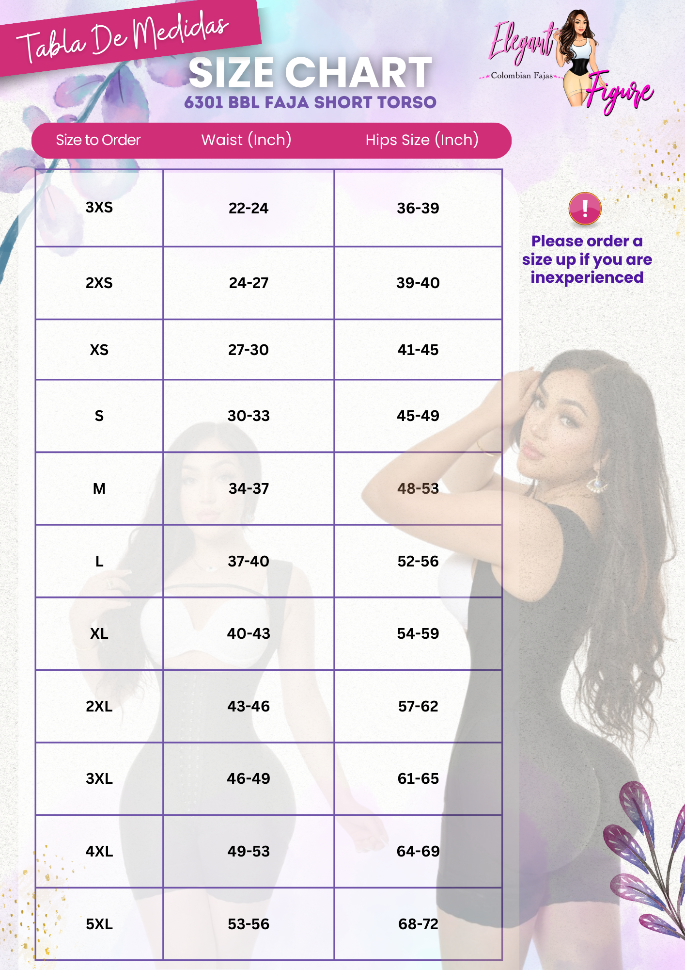 Style 6301 is specially designed to enhance and fit figures with a small waist and wide hips. It’s ideal for women with a BBL or naturally curvy bodies that need a more tailored fit at the waist and extra room in the hip area.