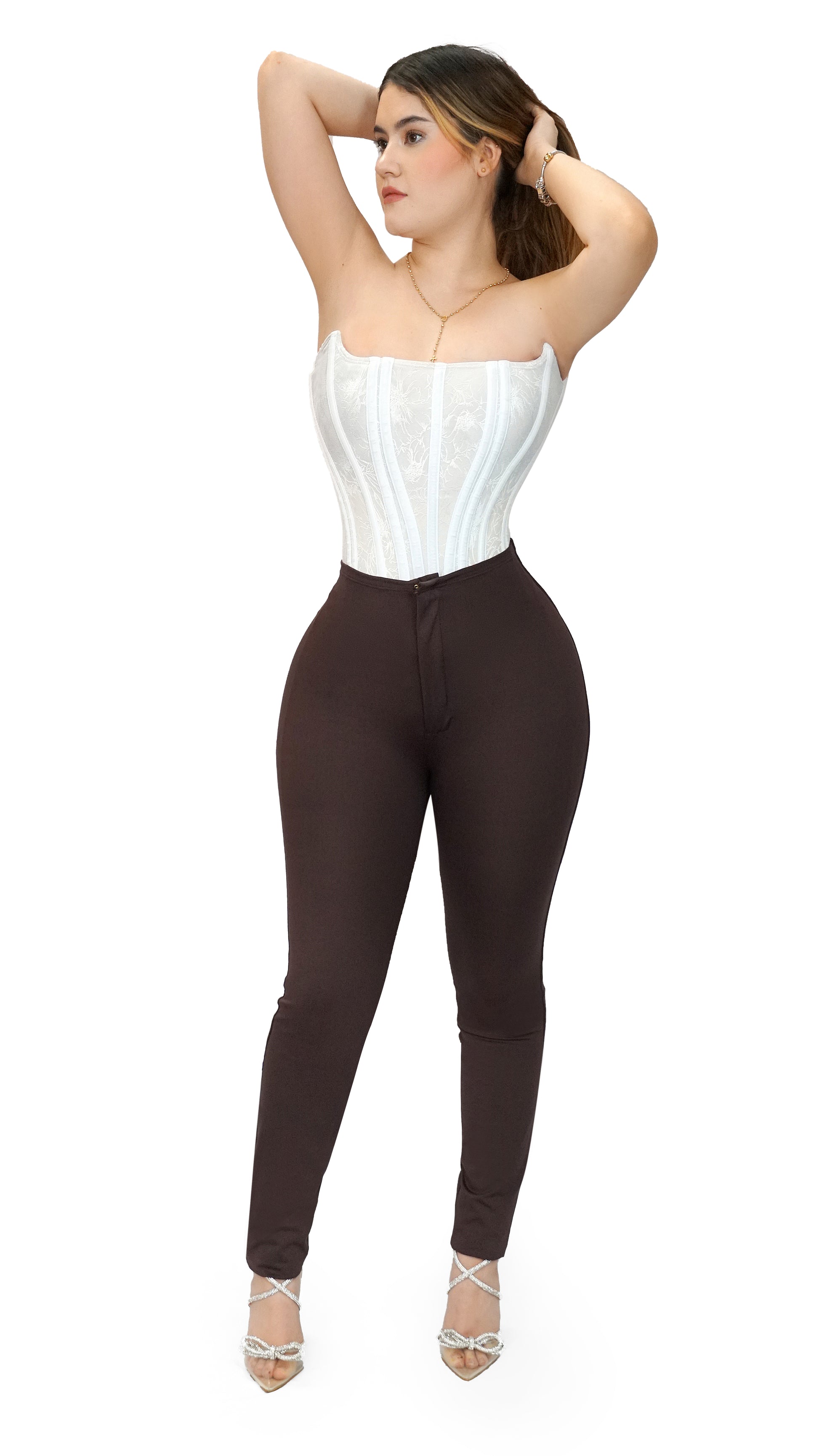 Leggings de alta compresión diseñados para brindar compresión localizada en la parte baja del abdomen. Cintura alta con doble faja integrada hasta las rodillas para un moldeado estructurado. Cuenta con dos aberturas internas para moldear los glúteos, además de una segunda faja interna diseñada para proporcionar un realce extremo. Incluye una fila de broches con cierre superior. Recomendado subir una talla arriba.